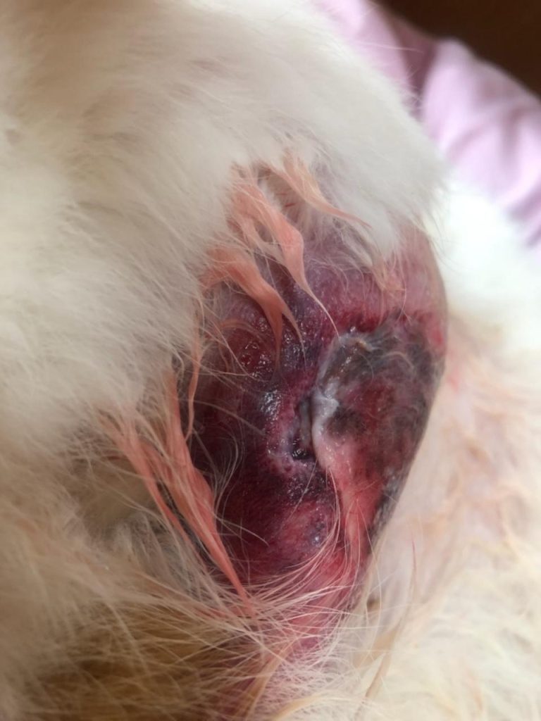 【2】3週間後 ↓ さらに大きくなり壊死して自壊。やがて黒い箇所は穴があきます。
